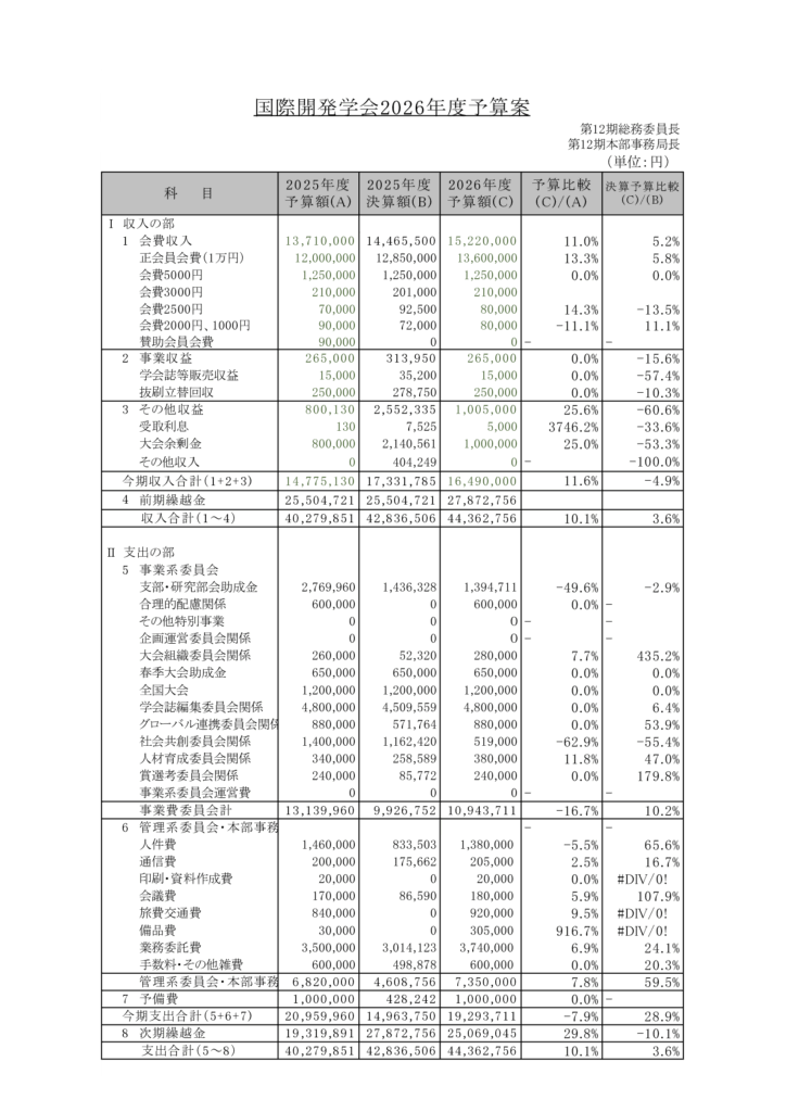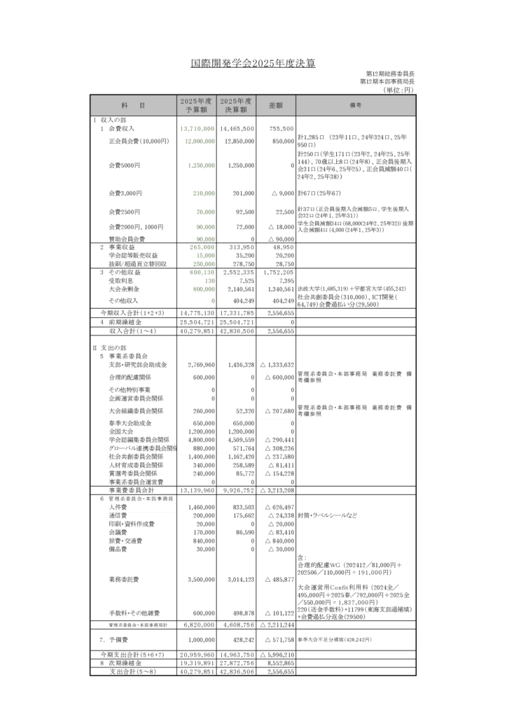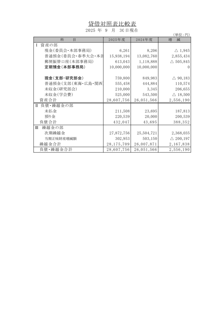 1. 2025 年度決算とりまとめと 2026 年度予算案作成を⾏った。また、2025 年度学 会決算ついての監査を受けた。